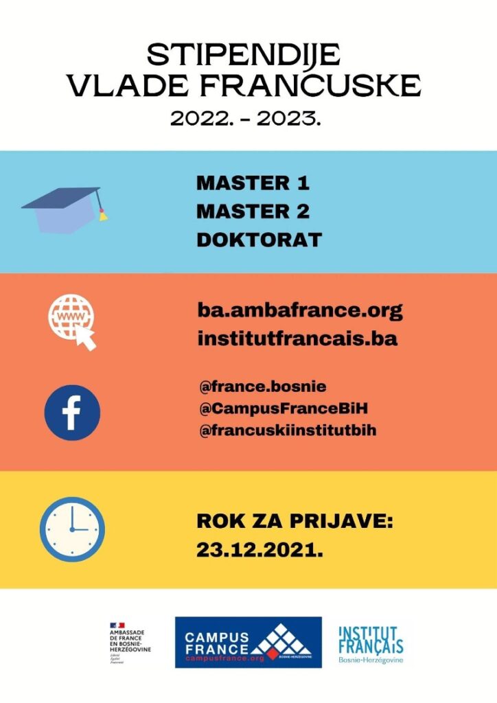 Do 23. decembra otvoren je konkurs Ambassade de France en Bosnie-Herzégovine / Francuska ambasada u BiH za stipendije za master i dvojni doktorat na koji se mogu prijaviti svi 🇧🇦bosanskohercegovački studenti!